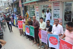 ১৯ অক্টোবার দুপুরে ময়মনসিংহ বিভাগীয় কমিশনারের অফিসের সামনে থেকে পাটগুদাম ব্রীজের মোড় পর্যন্ত ১২টি স্পটে মানববন্ধন কর্মসুচীতে বিভিন্ন পেশাজীবির মানুষসহ ছাত্র-জনতা অংশ নেন।