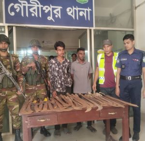 ময়মনসিংহ-৩ (গৌরীপুর) আসনে বিএনপির মনোনয়ন দ্বন্দ্বের জের ধরে হামলা ও ভাংচুরের ঘটনা ঘটেছে। এ ঘটনায় যৌথ বাহিনীর অভিযানে ৪০ রামদাসহ ৪ জনকে গ্রেপ্তার হয়েছে। গ্রেপ্তারকৃতরা হলেন, মো. শামীম (২৯), মো. মামুন (২৫), মো. হাবিব (১৯) এবং আফাজ (২২)। তারা গৌরীপুর উপজেলার স্থানীয় কাউরাট এবং পূর্বদাপুনিয়া গ্রামের বাসিন্দা। রবিবার (৯ নভেম্বর) সকালে গৌরীপুর পৌর শহরে যৌথ অভিযানে দেশিয় অস্ত্রসহ জড়িতদের গ্রেপ্তার করা হয়।